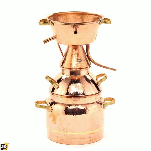 Hagyományos Alquitara lepárló vörösrézből, illóolaj, pálinka és borpárlat készítéséhez, kompakt kialakítással, 3 szűrőbetéttel.